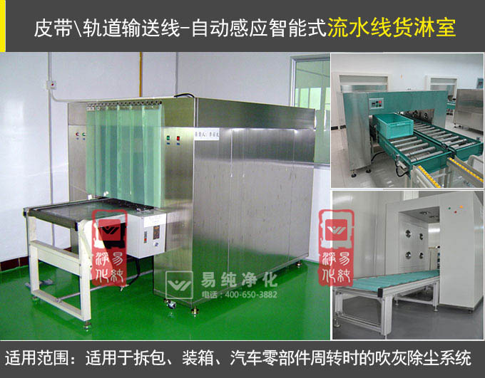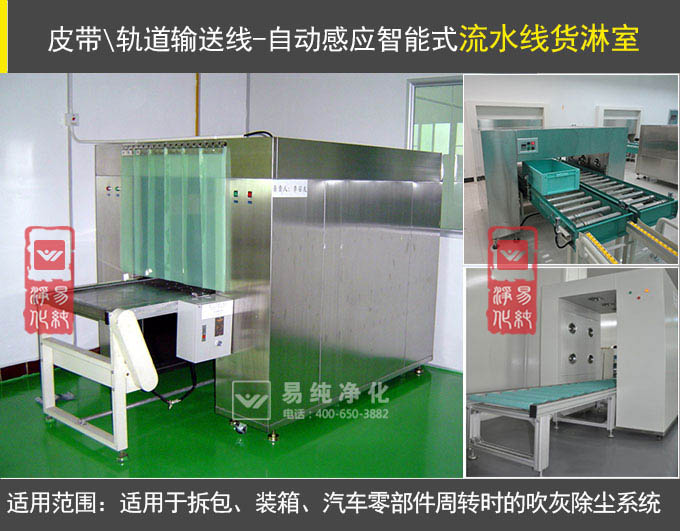 本文將重點(diǎn)介紹流水線貨淋室,此類貨淋室主要搭配輸送流水線配合使用。流水線是在一定的線路上連續(xù)輸進(jìn)貨物搬運(yùn)機(jī)械,又稱輸送線或者輸送機(jī)。按照輸送系列產(chǎn)品大體可分為皮帶流水線、滾筒線等流水線。一般包括牽引件承載構(gòu)件、驅(qū)動(dòng)裝置、改向裝置和和支撐件等,輸送機(jī)可進(jìn)行水平輸送。在輸送的過程中避免了人工操作,只需要設(shè)置感應(yīng)控制程序,當(dāng)物體達(dá)到或進(jìn)入貨淋室內(nèi)時(shí),貨淋室自動(dòng)啟動(dòng)吹淋,將進(jìn)入潔凈室或包裝間的物體表面的灰塵吹干凈。