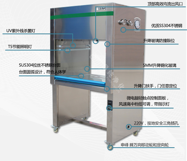 17.電器控制:控制面板上有紫外線殺菌燈,照燈,風(fēng)機(jī)調(diào)速控制軟觸點(diǎn)開(kāi)關(guān);